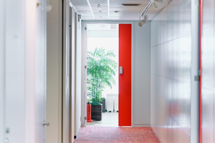 麻布十番駅直結のアクセスの良いオフィス。曲線を描くスタイリッシュな外観デザインが特徴的で、窓も多く、光が差し込む心地のよい空間となっています。ウォーターサーバーや休憩スペースもあります。