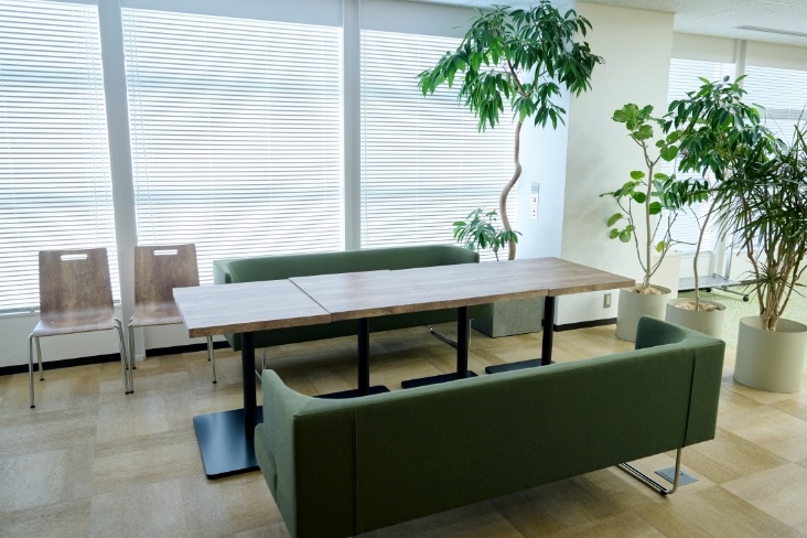 ウッドテーブルやソファーのある休憩スペース -